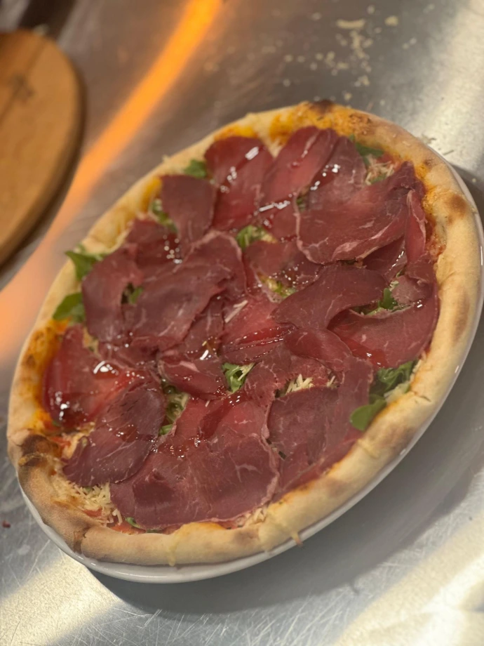Ein knusprig gebackener, goldener Teig bildet die Basis, belegt mit aromatischer Tomatensauce und feinem, geschmolzenem Käse. Darauf liegen hauchdünne Scheiben von luftgetrocknetem Rinderschinken, zart und leicht glänzend, die durch die Restwärme der Pizza ihr volles Aroma entfalten