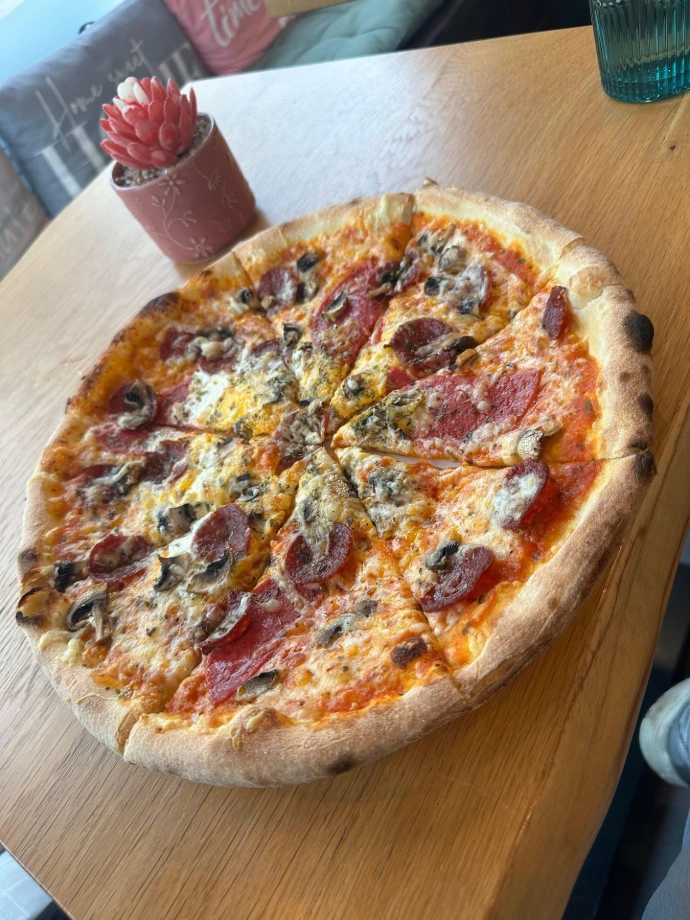 Ein kräftig gebackener, leicht geblisterter Rand hält einen saftigen Kern aus fruchtiger Tomatensauce und geschmolzenem Käse. Würzige Salamischeiben und aromatische Champignons verteilen sich gleichmäßig und geben jeder Ecke Tiefe und Biss. Der Boden ist dünn, aber stabil genau richtig, um jeden Schnitt sauber aufzunehmen.